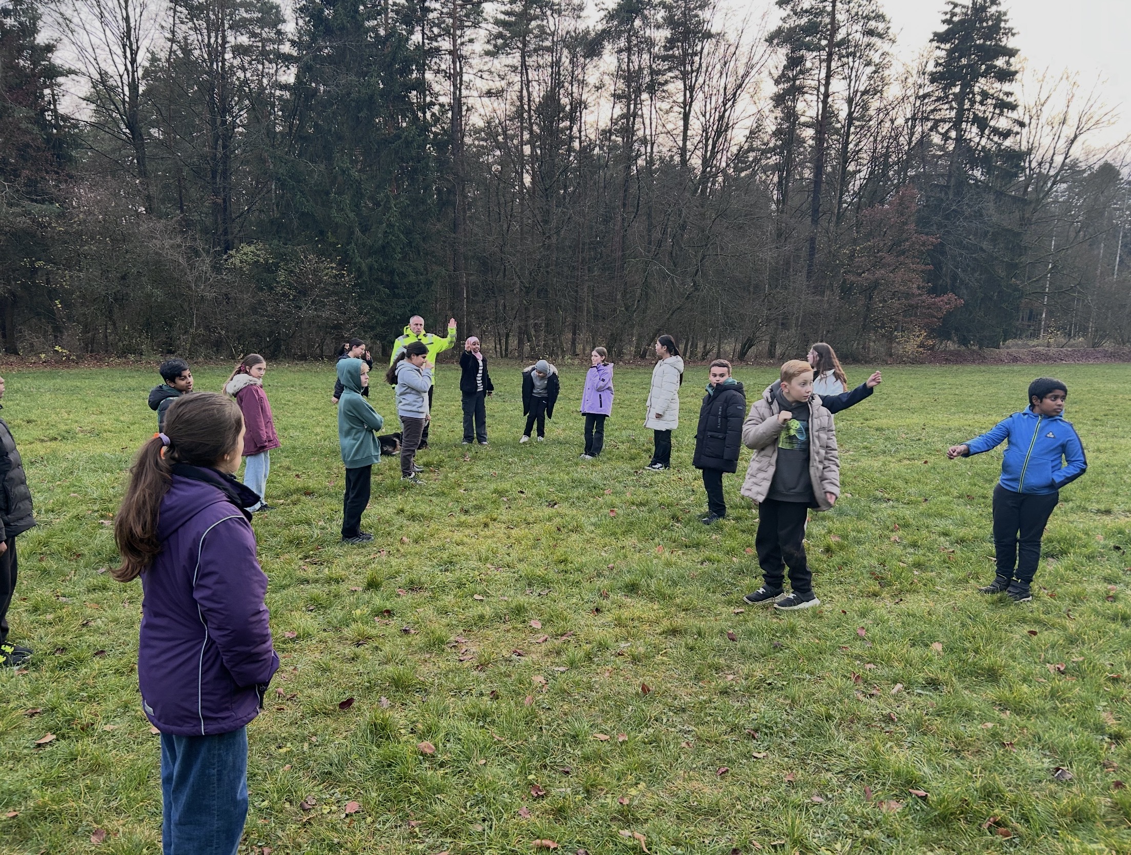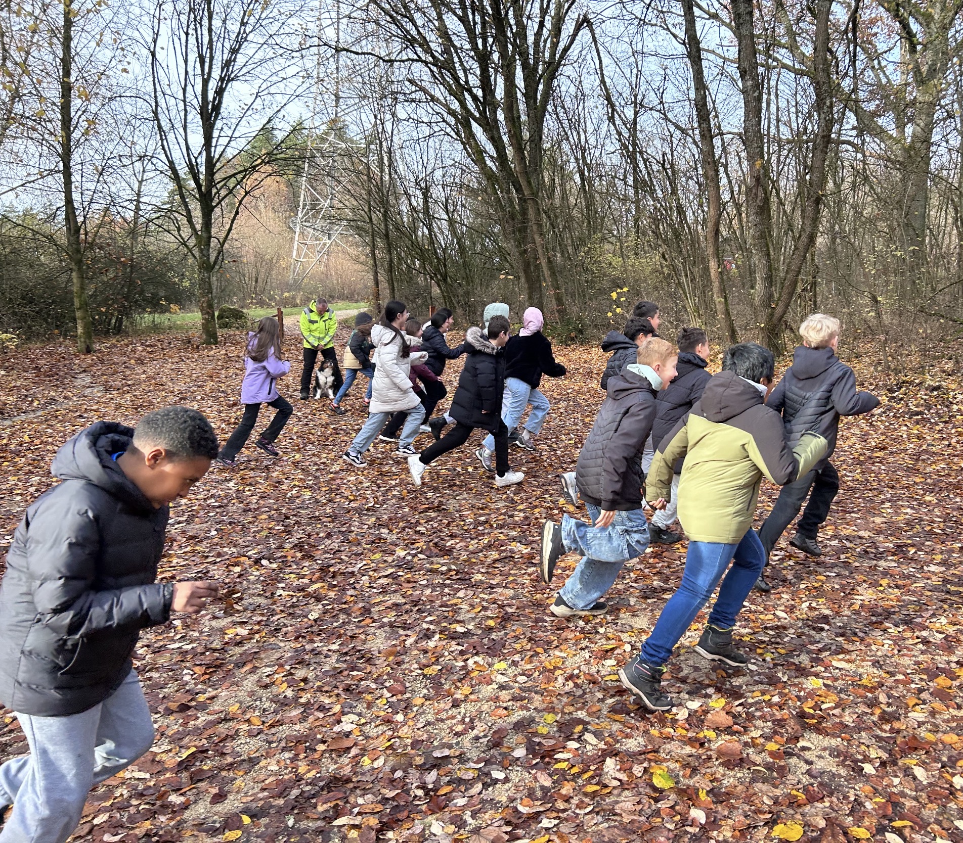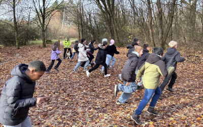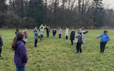 Tagsüber stand Teamwork auf dem Programm: Kooperationsspiele, Vertrauensübungen und jede Menge Aktionen, bei denen die 5d zeigte, dass sie zusammenhalten kann, selbst wenn man sich mal im Seil verhedderte oder beim Menschenschach kurz das Vertrauen in die Schwerkraft verlor. Auch die große Wanderung hatte es in sich: viel frische Luft, viele Schritte und noch mehr Motivation, endlich am Ziel anzukommen. DER Nervenkitzel schlechthin war die Nachtwanderung. Mit Taschenlampen bewaffnet stapfte die Klasse durch den dunklen Wald und entdeckte, dass man in der Dunkelheit nicht nur Bäume, sondern auch die eigenen Klassenkameraden plötzlich sehr spannend finden kann. Die Kunst sollte auch nicht zu kurz kommen. Nach der Kunstform „Land Art“ sollten mit natürlichen Materialien wie Steinen, Erde, Blättern und Ästen, vergängliche Kunstwerke erschaffen werden.
