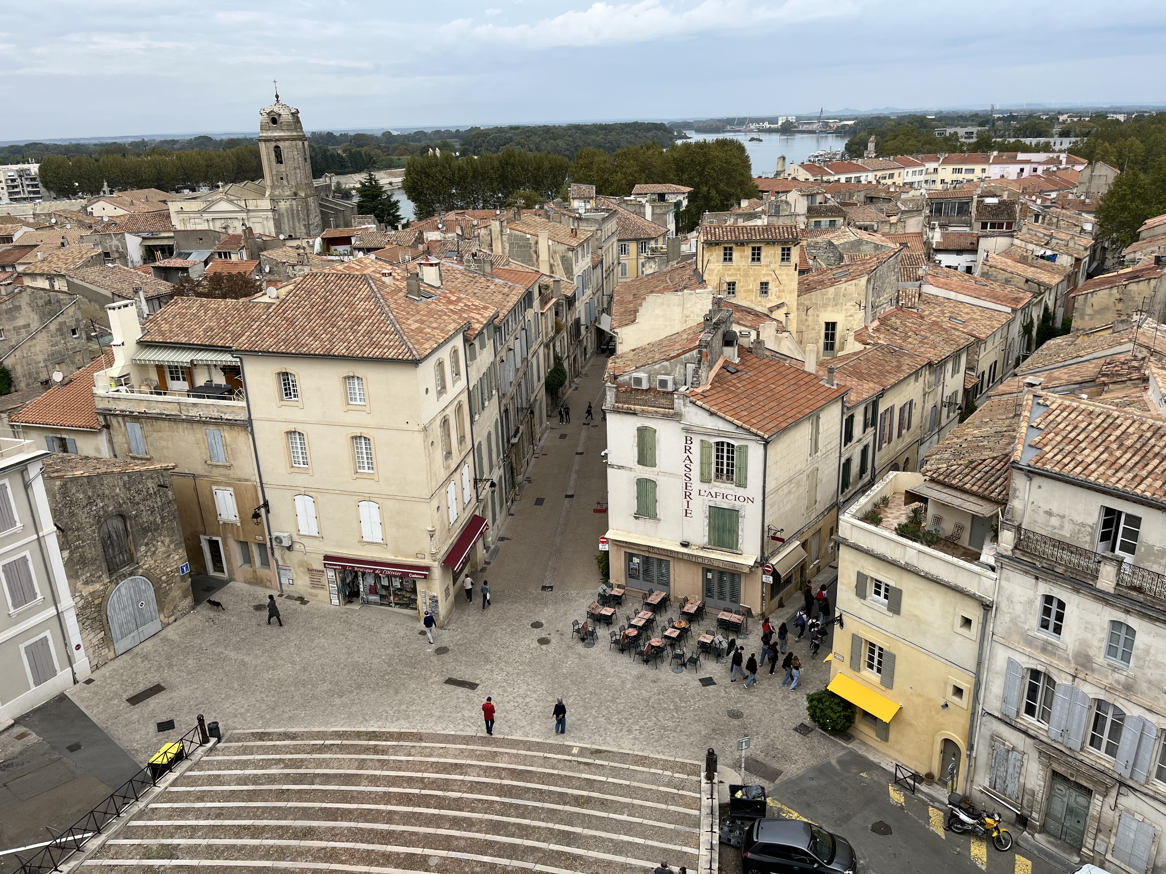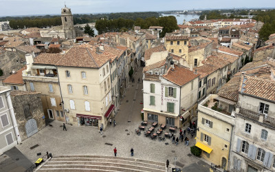 Zu unserer großen Freude erfüllt sie tatsächlich die hohen Erwartungen, die die Homepage geschürt hatte: Gemütliche Zimmer, ein Pool im Freien und eine Terrasse mit einem sagenhaften Ausblick auf die Rhone mit der berühmten Brücke sowie dem wuchtigen Papstpalast begeistern auf Anhieb. Nach einer kurzen Nacht beginnen wir unsere Südfrankreich-Tour am nächsten Morgen gleich noch ein Stück weiter südlich: In Arles erkunden wir das beeindruckende Amphitheater und die verwinkelte Altstadt. Wer will, kann auch die Nekropole (ein antik-mittelalterlicher Friedhof) und die altrömischen Constantin-Thermen besichtigen. Bei bestem Wetter genießen wir südfranzösische Spezialitäten. Oder auch einfach amerikanische Fastfoodangebote, die jedoch nach Ansicht der Schülerschaft nicht den identischen Geschmack bieten wie zu Hause. Am Nachmittag darf die Klasse in Kleingruppen die Stadt auf eigene Faust erkunden, bevor es mit dem TER-Zug wieder nach Avignon geht. Der Bus zur Jugendherberge hält praktischerweise direkt vor einer Bäckerei, die eine breite Auswahl typisch französischer Backwaren anbietet. Mit Baguette, Quiche und Brioches bewaffnet ziehen wir uns in die Herberge zurück und genießen den Abend.