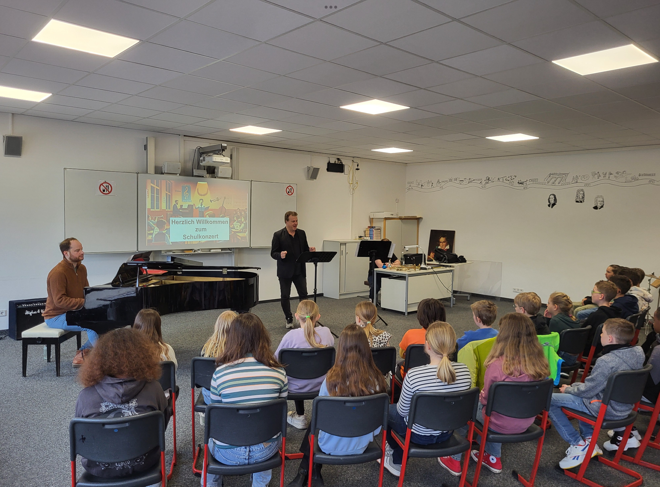 Die jungen Zuhörer wurden von Martin Fösel als Tenor, Sebastian Hensiek an der Trompete und Patrik Hévr am Flügel in die Welt der Musik entführt: Das abwechslungsreiche Programm bot einen Mix aus klassischer und moderner Musik. Werke von John Dowland, Georg Friedrich Händel, Ludwig van Beethoven und Wolfgang Amadeus Mozart standen ebenso auf dem Spielplan wie Kompositionen von Bertrand Moren, Claude Debussy und Alexander Arutjunjan. Besonders begeistert waren die Schülerinnen und Schüler von dem mitreißenden "Theme from Rocky" von William Conti und des Titelsongs der Adams Family.
