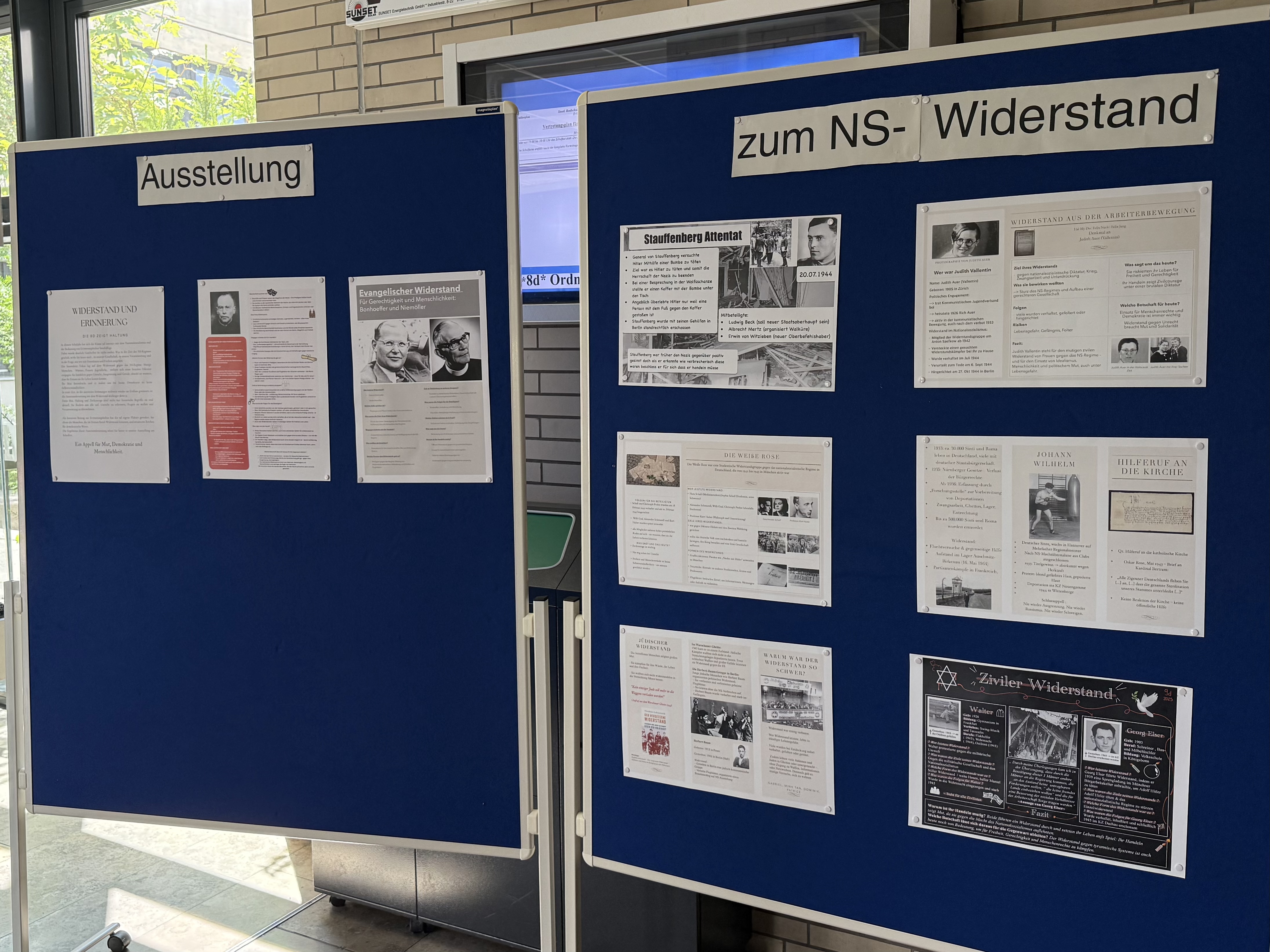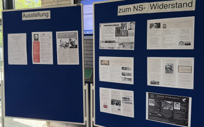Beim diesjährigen Schulfest präsentierte die Klasse 9d ihre Ausstellung zum Thema Widerstand im Nationalsozialismus. Die Plakatausstellung war das Ergebnis einer intensiven Auseinandersetzung im Geschichtsunterricht mit dem NS-Regime und der Frage, wie Menschen damals Mut bewiesen haben, um sich gegen Unrecht und Gewalt zu stellen. Die Ausstellung bestand aus acht selbst gestalteten Plakaten, auf denen verschiedene Formen des Widerstands dargestellt wurden. Thematisiert wurden unter anderem der zivile, der religiöse, der militärische sowie der Widerstand von Jüdinnen und Juden, von Sinti und Roma und aus der Arbeiterbewegung. Auch die berühmte studentische Widerstandsgruppe „Weiße Rose“ war Teil der Präsentation. Die Plakate wurden auf Stellwänden nebeneinander angebracht und informierten sachlich und anschaulich über zentrale Persönlichkeiten, Beweggründe und Risiken der Widerständlerinnen und Widerständler. Viele Besucherinnen und Besucher des Schulfests hielten an, lasen interessiert die Texte und zeigten sich beeindruckt von der Arbeit der Klasse. Die 9d hat mit ihrer Ausstellung ein wichtiges Thema in den Mittelpunkt gerückt und deutlich gemacht, dass Erinnern mehr ist als das Wiederholen historischer Daten. Es bedeutet, sich mit Fragen zu beschäftigen, die auch heute nicht an Bedeutung verloren haben: Was ist Gerechtigkeit? Wann ist es richtig, sich zu widersetzen? Und wie können wir als Gesellschaft wachsam bleiben gegenüber Ausgrenzung, Hass und autoritären Tendenzen? Gerade in Zeiten, in denen demokratische Werte wieder unter Druck geraten, ist es entscheidend, dass junge Menschen lernen, Haltung zu zeigen. Die Ausstellung war daher nicht nur ein Rückblick in die Vergangenheit, sondern auch ein Aufruf an uns alle, Verantwortung zu übernehmen.