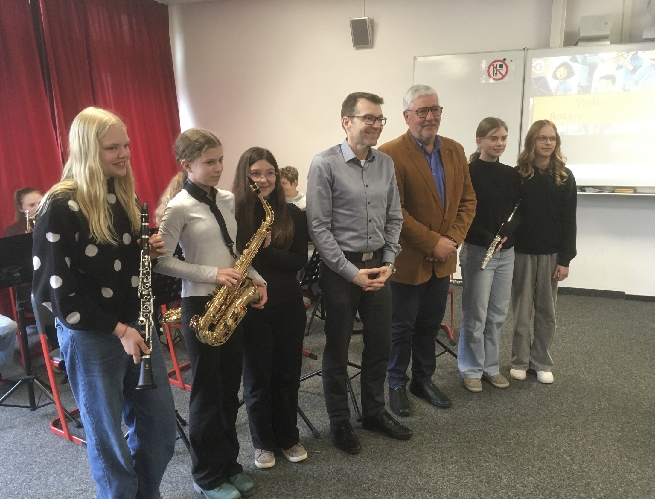 Im Rahmen der Übergabe würdigte Herr Lehmann stellvertretend für die Rotarier das besondere Engagement unserer Schule im Bereich Musik und Kultur. In seiner Ansprache berichtete er auch von seiner eigenen Schulzeit: Als ehemaliger Realschüler habe er auf einer Leihposaune das Posaunenspiel erlernt. Besonders hob er die nachhaltige positive Wirkung des Musizierens auf die persönliche Entwicklung sowie auf den späteren beruflichen Werdegang hervor.