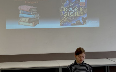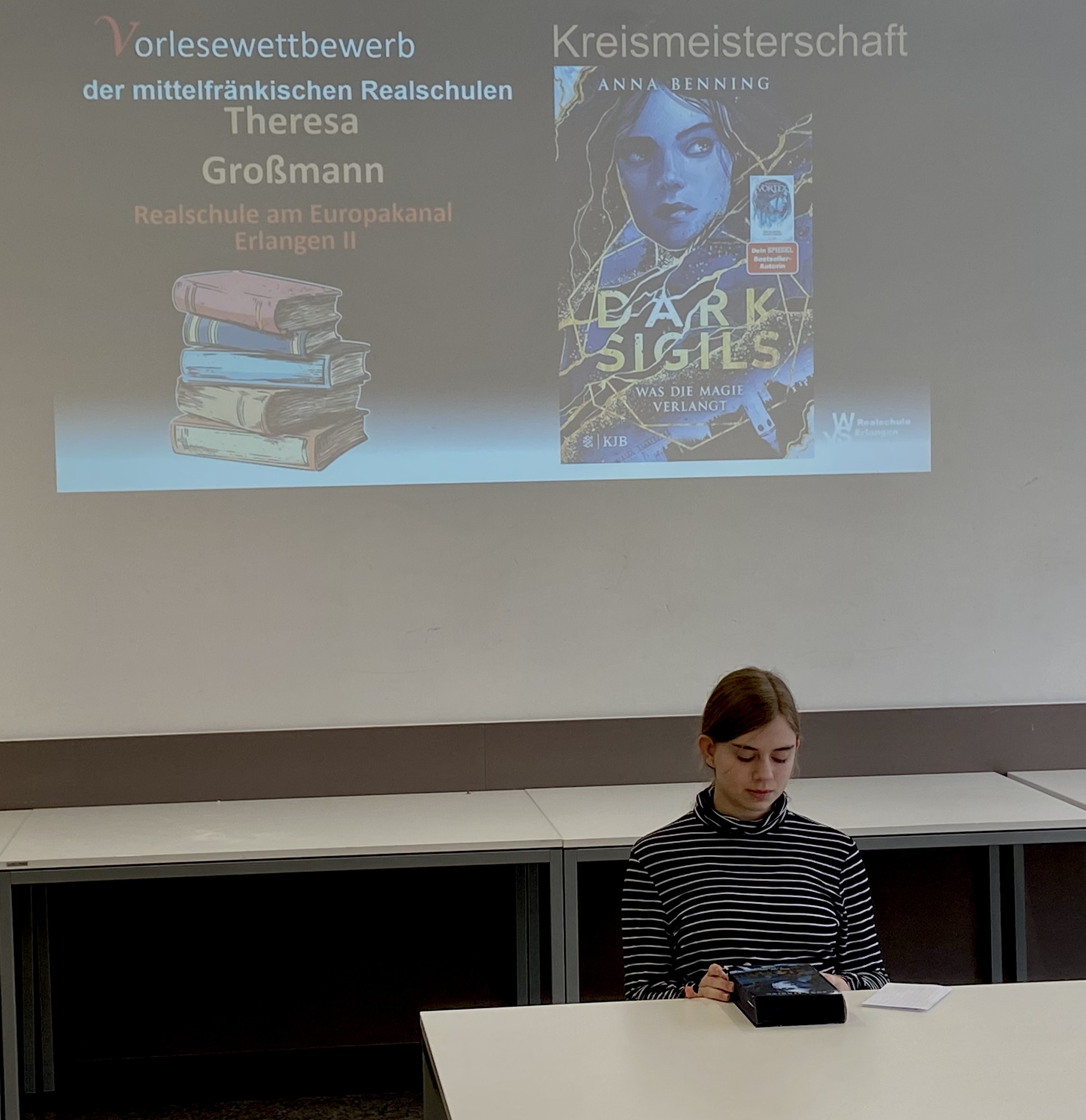 Schulintern hatten sich Theresa Großmann (7e) und Milena Predukh (7c) bereits Anfang Dezember gegen ihre Konkurrenz aus der siebten Jahrgangsstufe durchgesetzt, weshalb es für das talentierte Duo nun zwei Monate später zum Kreisentscheid des Vorlesewettbewerbs der Mittelfränkischen Realschulen ging. Eine weite Anreise hatten unsere Schülerinnen dabei nicht zu bewältigen, fand die Veranstaltung dieses Jahr doch nur einen Katzensprung entfernt an der benachbarten Werner-von-Siemens-Realschule statt. Bei Tee und Kuchen sowie später Pizza und Laugenstangen konnten sich die beiden Leserinnen auf den Wettbewerb einstimmen, ehe unter anderem gegen die heimische sowie etwa aus Höchstadt, Herzogenaurach oder Langenzenn angereiste Konkurrenz gelesen wurde. Neben den Lehrkräften – die jedoch bei Schülerinnen und Schülern der eigenen Schule keine Punkte vergaben – bestand die Jury auch aus zwei externen Mitgliedern, Herr Rogenwald von der Stadtbibliothek Erlangen sowie Heidi Goczoll von der Buchhandlung „LeseeseL“, die überdies auch die Buchpreise und Gutscheine stiftete. Das Los entschied zu Beginn über die Lese-Reihenfolge und so kam es, dass Theresa Großmann den Wettbewerb mit der von ihr gewählten dreiminütigen Stelle aus „Dark Sigils“ von Anna Benning eröffnete. Später las Milena Predukh aus „Die Pfefferkörner und der Fluch des schwarzen Königs“ von Sarah Bosse. Ihr Einsatz samt Buchvorstellung ist umso höher einzuschätzen, als dass sie als dritte Schulsiegerin sehr spontan für den kurzfristig ausfallenden Zweitplatzierten einsprang. Wie erwartet war das Vorlese-Niveau unter allen Schulsiegern in Mittelfranken sehr hoch, so dass die Punktzahlen am Ende nah beieinanderlagen. Nach längerer Beratung kürte die Jury Siegerinnen und Sieger. Milena Predukh und Theresa Großmann freuten sich über einen geteilten dritten Platz.
