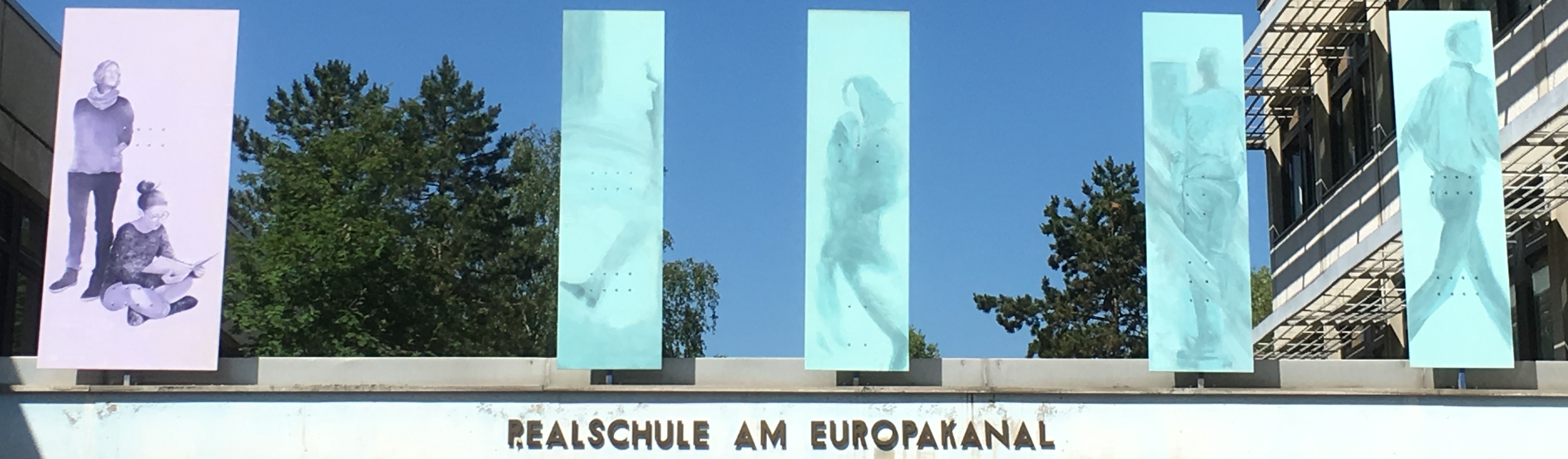 Wir verwandelten die eintönige Klinkerwand in der Pausenhalle in eine glitzernd-bewegte Spiegelmosaik-Fläche, einheitlich braune Türen bekamen Farbe, das Treppenhaus und andere Bereiche wurden mit großformatigen Gemälden und einem Mobile über zwei Stockwerke gestaltet, Reliefs und figürliche Plastiken wurden angefertigt, Bildergalerien in Gängen angelegt, Sitzgelegenheiten und Stehtische entworfen und hergestellt, die Schulverfassungssäulen in der Pausenhalle gebaut, Fensterflächen mit Plexiglas und Folien gestaltet, Zitate außerhalb auf Mauern, ein großes Mandala auf den Schulhof gemalt, die Musiksaal-Fassade mit Malerei und Mosaik gestaltet, eine Installation auf dem Eingangsdach angebracht...
