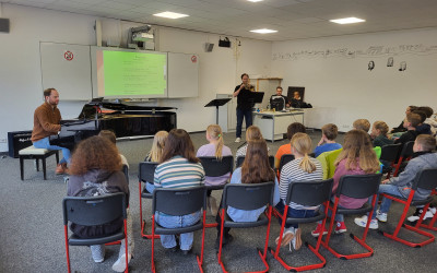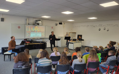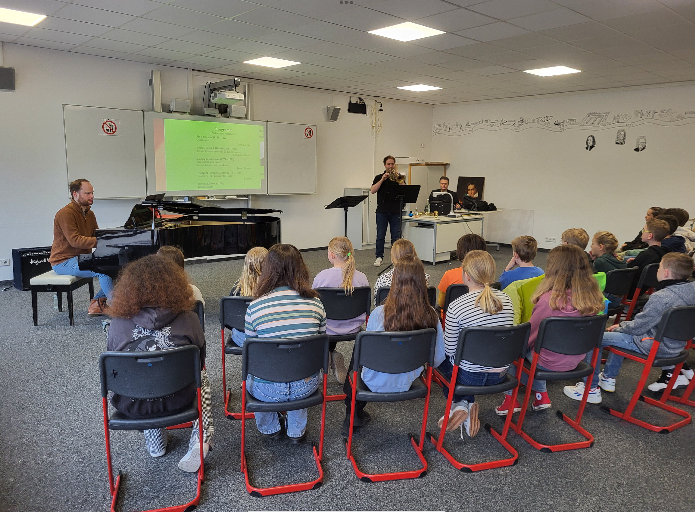 Die jungen Zuhörer wurden von Martin Fösel als Tenor, Sebastian Hensiek an der Trompete und Patrik Hévr am Flügel in die Welt der Musik entführt: Das abwechslungsreiche Programm bot einen Mix aus klassischer und moderner Musik. Werke von John Dowland, Georg Friedrich Händel, Ludwig van Beethoven und Wolfgang Amadeus Mozart standen ebenso auf dem Spielplan wie Kompositionen von Bertrand Moren, Claude Debussy und Alexander Arutjunjan. Besonders begeistert waren die Schülerinnen und Schüler von dem mitreißenden "Theme from Rocky" von William Conti und des Titelsongs der Adams Family.