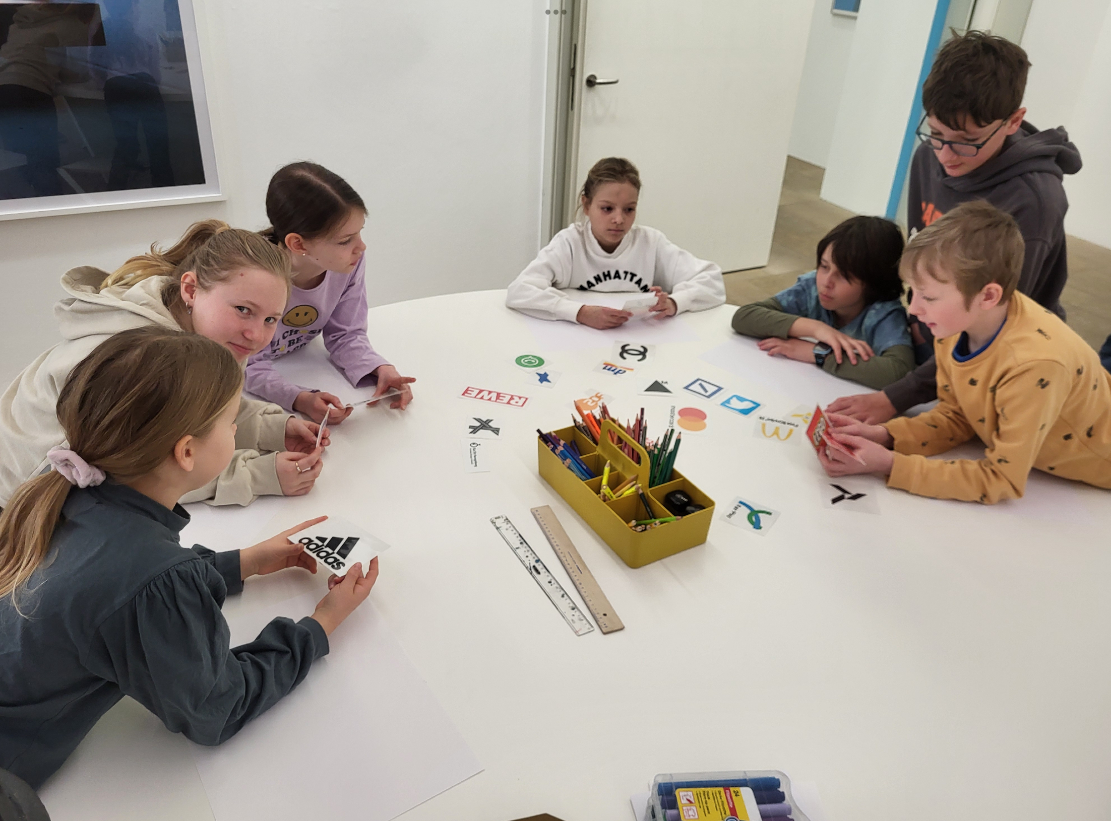 Im anschließenden Workshop durften sie eigene Kunstwerke gestalten. Dabei entstanden fantasievolle Logos für erfundene Firmen und Produkte sowie eindrucksvolle Bilder in Collage-Technik. Die kreative Arbeit bereitete allen viel Freude und zeigte, wie vielfältig Kunst sein kann.