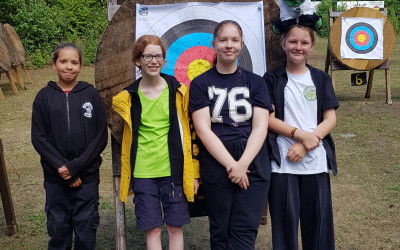 Bayerische Schulmeisterschaft 2025 im Bogenschießen in Feucht, die Realschule am Europakanal war wieder dabei! Unsere Schule vertreten haben: Camron Pickett, Franziska Purkott, Marina Heß und Olivia Wicke. Wir waren dieses Mal also mit vier Teilnehmenden dabei, so dass wir eine Mannschaft stellen konnten, die nach insgesamt mehr als 6.000 geschossenen Pfeilen auf dem 9. Platz notiert wurde. Einmal mehr war es faszinierend, die Disziplin und die Ausdauer der Schülerinnen und Schüler zu erleben, noch dazu bei mehreren Stunden strömenden Regen!