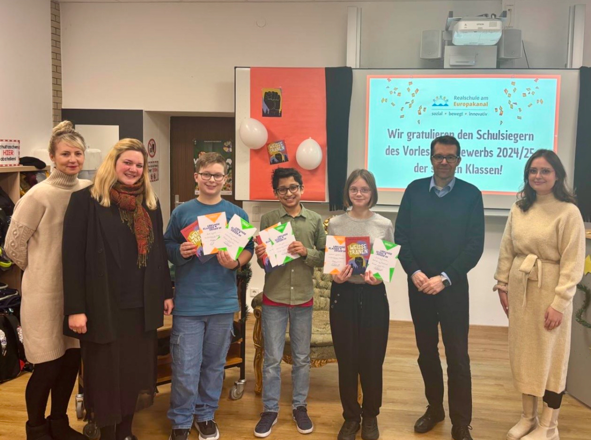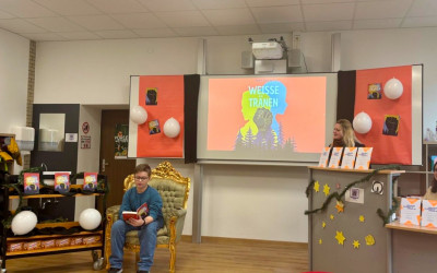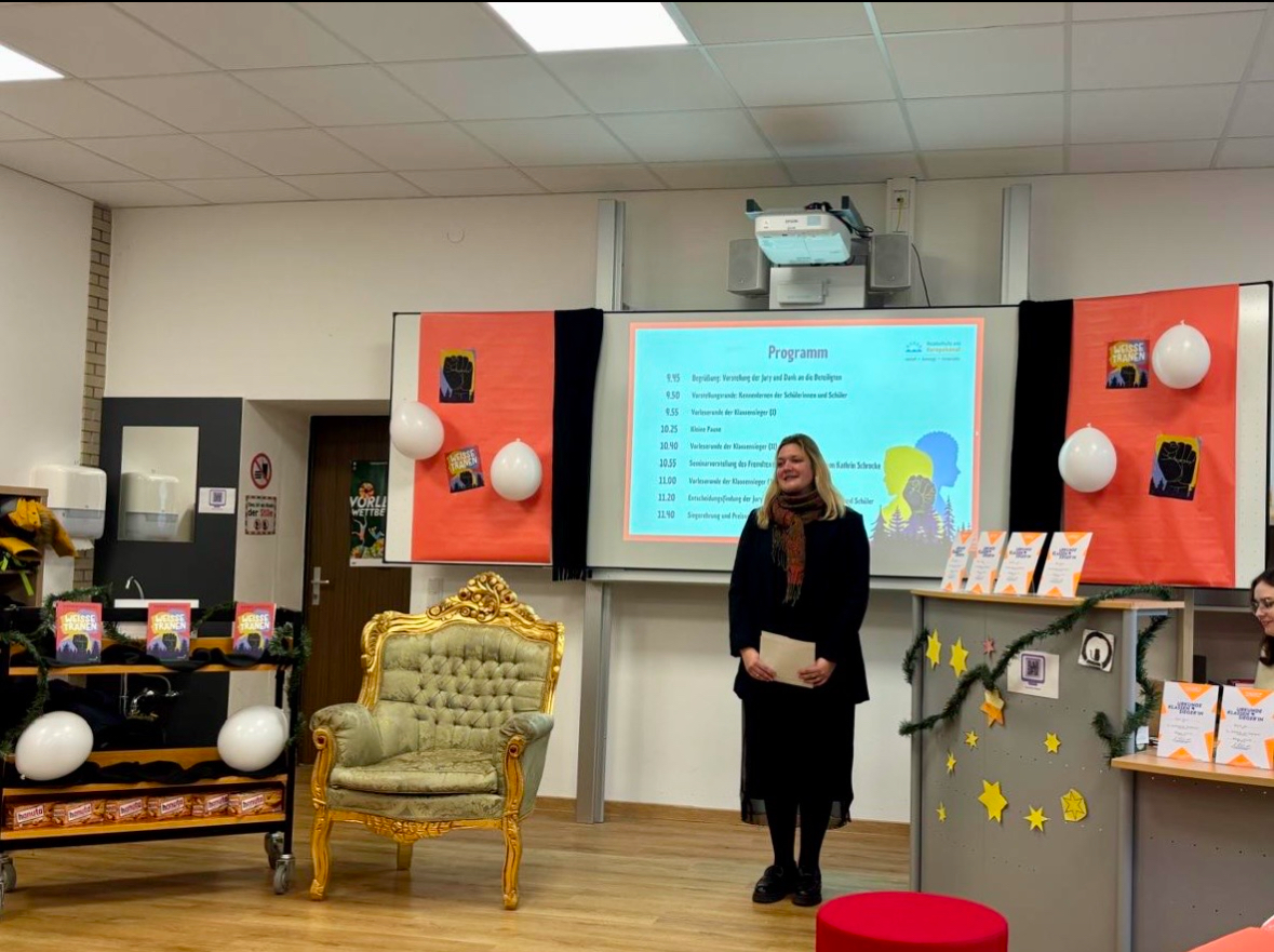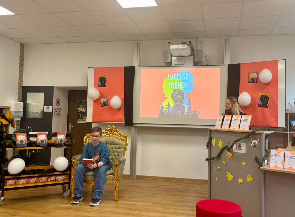 Die zuvor ermittelten Klassensiegerinnen und Klassensieger traten in zwei spannenden Runden gegeneinander an. Im ersten Durchgang präsentierten die Teilnehmenden eine selbst gewählte Textstelle aus ihrem Lieblingsbuch. In der zweiten Runde wartete eine besondere Herausforderung: ein Fremdtext. Hierbei handelte es sich um eine Passage aus dem Buch „Weiße Tränen“ von Kathrin Schrocke, das passend zum diesjährigen Jahresthema „Respekt“ ausgewählt wurde.