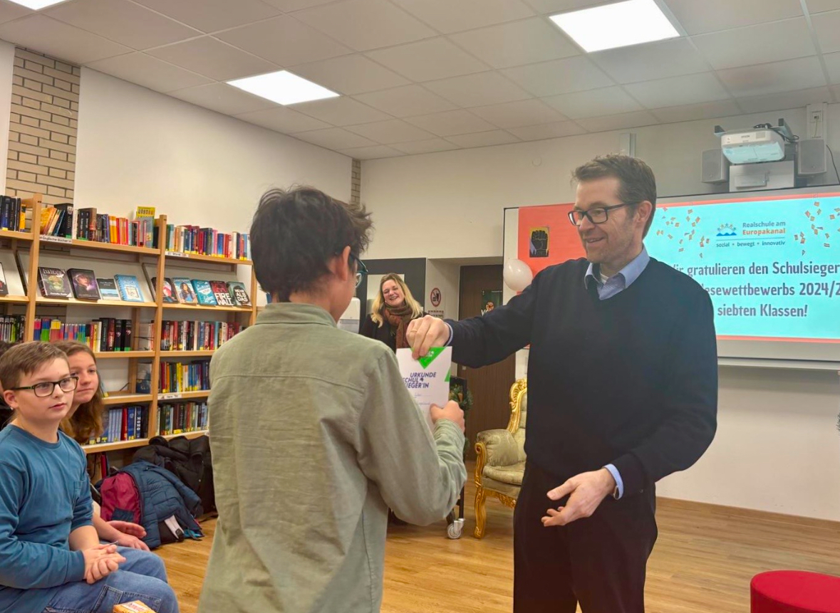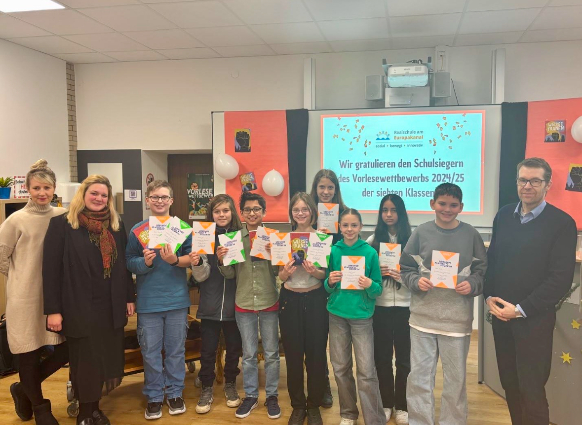 Die Jury, bestehend aus dem Schulleiter Herrn Bölling, den Seminarlehrkräften Frau Heß und Herrn Wörner sowie der Referendarin Frau Wartenberg, bewertete die Lesetechnik, Interpretation und Ausdruckskraft der Vorträge. Besonders überzeugen konnte Kian Saboor aus der Klasse 7d, der mit seiner ausdrucksstarken und mitreißenden Lesung den ersten Platz belegte. Auf Platz zwei folgte Vincent Nickl aus der 7a, der die Jury mit seiner Lesesicherheit beeindruckte. Josephine Gumbrecht aus der 7b sicherte sich mit ihrem lebendigen Ausdruck den dritten Platz. Die Gewinnerinnen und Gewinner freuten sich über Buchpreise und Urkunden. An dieser Stelle einen großen Dank an den Freundeskreis, der großzügig die Preise gestiftet hat. Die ersten beiden Schulsieger werden die Realschule am Europakanal beim Kreisentscheid in Höchstadt vertreten.