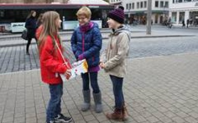 Um 9:00 Uhr war Treffpunkt am Hugenottenplatz in Erlangen und dann wurde erst mal der große Stand von "terre des hommes" aufgebaut. Das ging mit vereinten Kräften natürlich "ratz-fatz" und die Bauchläden wurden kurze Zeit später mit allerlei Dingen gefüllt, egal ob mit gebastelten Lesezeichen, Einkaufswagen-Chips, Putztüchern, Streichhölzern, Buttons bis hin zu von den Schülern mitgebrachten Süßigkeiten. Damit haben sich die Kinder in kleinen Gruppen in der Fußgängerzone verteilt und kräftig gesammelt. Schon kurze Zeit später haben alle große Erfolge verbuchen können, was die Motivation natürlich nur noch steigerte. Die Klasse ging voll und ganz in ihrer Aufgabe auf und immer wieder wurde zum Stand zurückgekehrt, um die Bauchläden neu aufzufüllen, um den Passanten auch etwas für ihre Spende zu geben.
