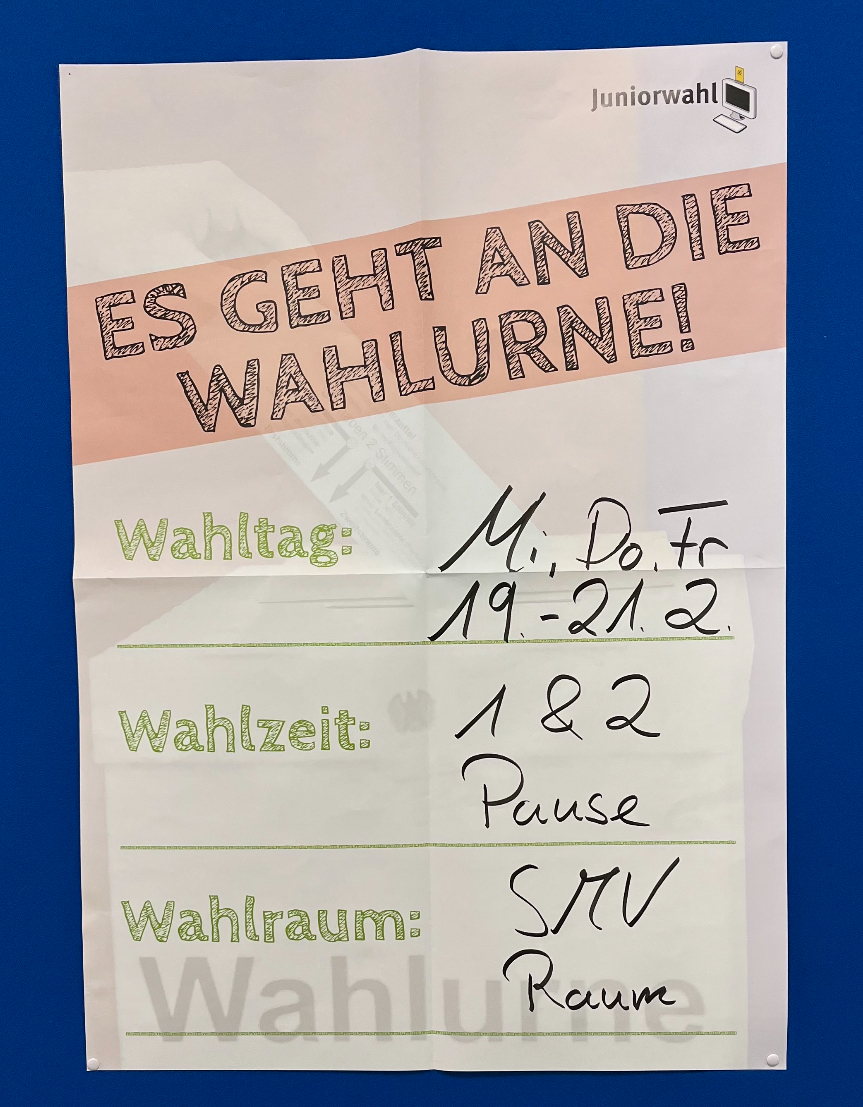 Zur vorgezogenen Bundestagswahl hat unsere Schule am Projekt Juniorwahl teilgenommen. Als der Termin für die Wahl feststand, war für uns als SMV klar, dass gerade in diesen bewegenden Zeiten Politik auch eine Rolle an unserer Schule spielen muss. Somit fiel die Entscheidung nicht schwer, eine eigene Wahl für unsere Schülerinnen und Schüler zu organisieren. Dabei hat uns das Projekt Juniorwahl sehr unterstützt. Nach der Anmeldung wurde uns eine breite Auswahl an Materialien zugeschickt: Von Werbeplakaten bis hin zu einer richtigen Wahlurne und natürlich den Stimmzetteln wurde alles bereitgestellt.