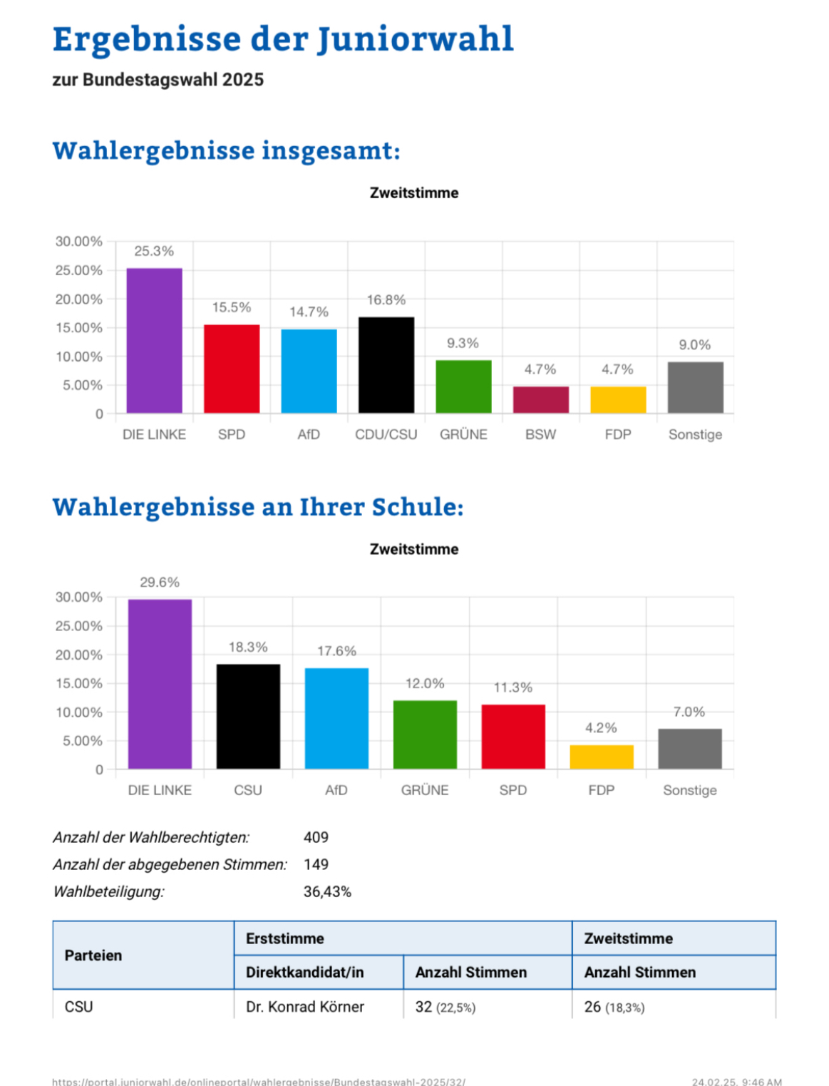 Schülerinnen und Schüler die Möglichkeit, ihre Stimme abzugeben. Das SMV-Zimmer diente als Wahlbüro und war von Mittwoch bis Freitag in den Pausen geöffnet. Noch am Freitag wurden die Stimmen ausgezählt und übermittelt. Sowohl bei der Erststimme als auch bei der Zweitstimme gewann "Die Linke" (siehe Ergebnisgrafik).
