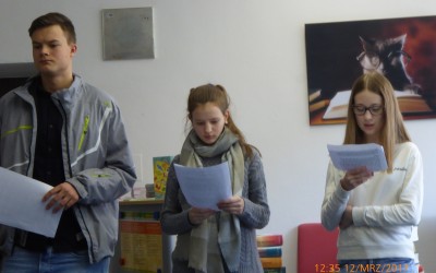 Am Dienstag, dem 14.3., 10:00 h war nun die feierliche Eröffnung. Nicht nur die Schulgemeinschaft würdigte das Engagement der Schüler, sondern auch Vertreter der Stadt bedankten sich für den Einsatz. So sprach Herr Till Fichtner als Leiter des Amtes für Chancengleichheit und Vielfalt und Frau Ester Klaus (Vorsitzende der Jüdischen Kultusgemeinde Erlangen) zu den Versammelten. Gerade jetzt sei es wichtig, die Erinnerungskultur wach zu halten, da es Strömungen gibt, die das Gewesene verharmlosen oder negieren. Schließlich lasen Samuel Bährle, Hanna Henke und Veronika Schmitt als Vertreter der Schülerschaft aus dem Tagebucheintrag eines 12jährigen jüdischen Mädchens aus Pilsen, das 1941 bis 1942 - dem Jahr, in dem sie deportiert wurde - einfühlsam vor. Begleitet wurde die Feier durch die Musik zweier jüdischer Musikanten, die dem Ganzen einen besonderen Rahmen gaben.