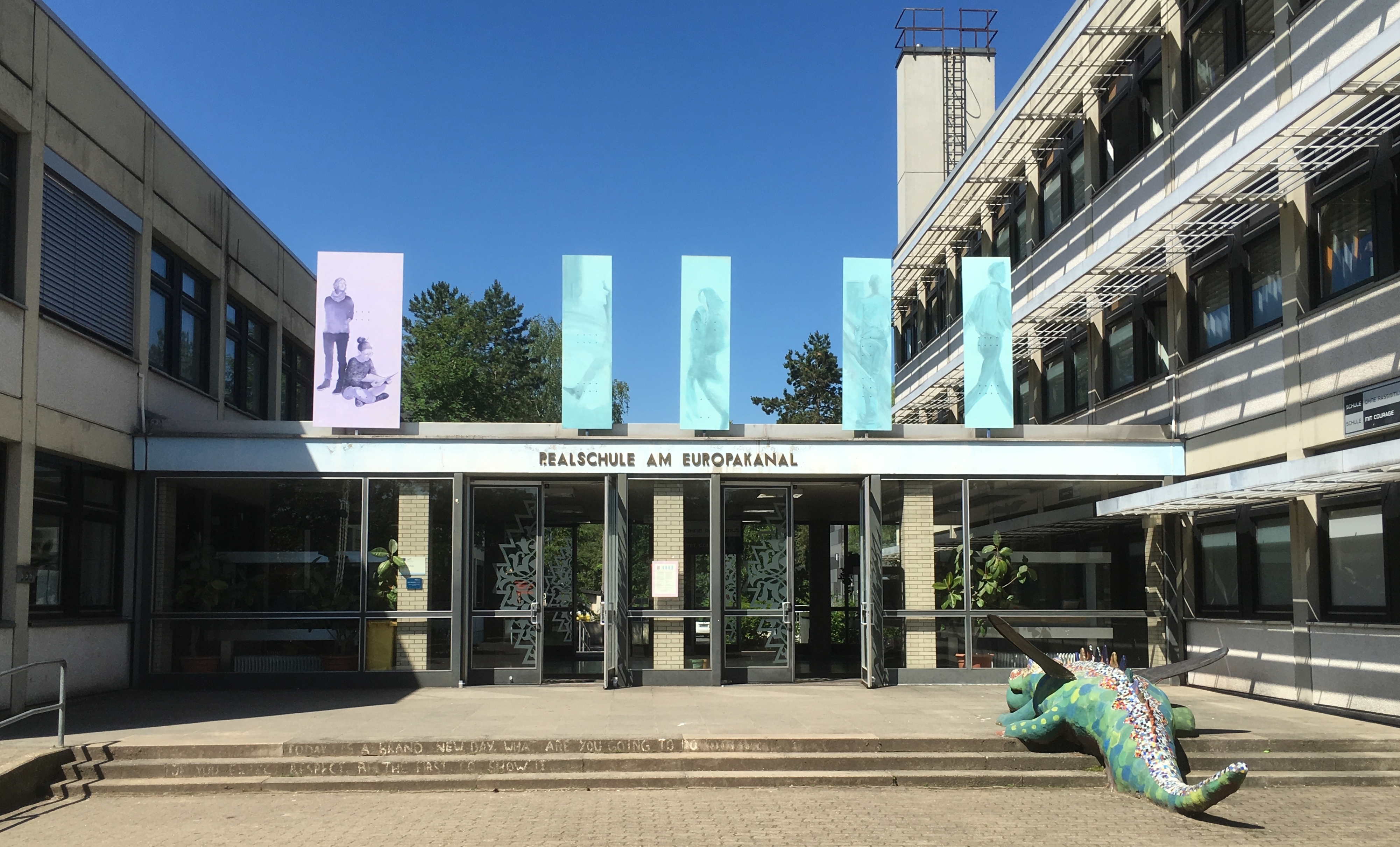 Wir verwandelten die eintönige Klinkerwand in der Pausenhalle in eine glitzernd-bewegte Spiegelmosaik-Fläche, einheitlich braune Türen bekamen Farbe, das Treppenhaus und andere Bereiche wurden mit großformatigen Gemälden und einem Mobile über zwei Stockwerke gestaltet, Reliefs und figürliche Plastiken wurden angefertigt, Bildergalerien in Gängen angelegt, Sitzgelegenheiten und Stehtische entworfen und hergestellt, die Schulverfassungssäulen in der Pausenhalle gebaut, Fensterflächen mit Plexiglas und Folien gestaltet, Zitate außerhalb auf Mauern, ein großes Mandala auf den Schulhof gemalt, die Musiksaal-Fassade mit Malerei und Mosaik gestaltet, eine Installation auf dem Eingangsdach angebracht...